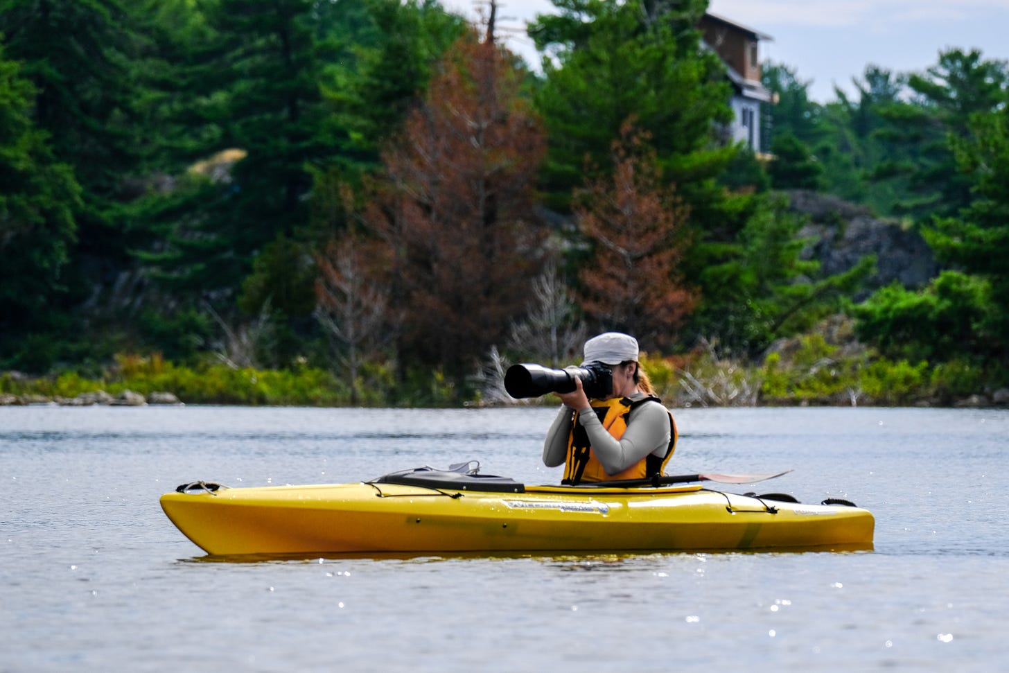 In order to decide what’s best, you need to think about what you want your results to be. If you simply want to document your adventures while kayaking, a small waterproof camera or smartphone (in a waterproof case) will be sufficient. But if your goal is to get award-winning bird shots, you will need to invest in a good camera body and a long lens. The longer, the better but with that comes added weight and expense, as well as making it harder to handhold.